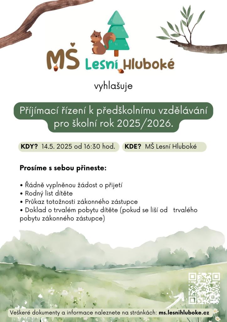 MŠ Lesní Hluboké oznamuje, že příjímací řízení pro školní rok 2025/2026 proběhne 14. května 2025 od 16:30 hod. Zájemci jsou vyzváni, aby přinesli vyplněnou žádost o přijetí, rodný list dítěte, průkaz totožnosti zákonného zástupce a doklad o trvalém pobytu dítěte. Více informací naleznete na webových stránkách školky ms.lesnihluboke.cz