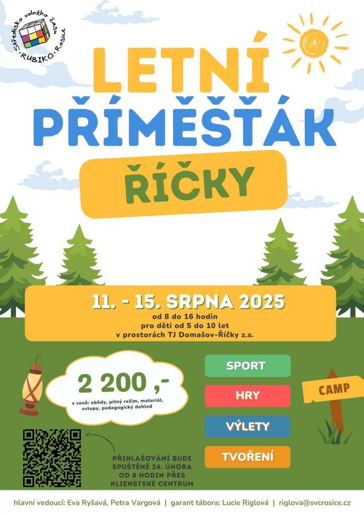 Srdečně zveme všechny děti z blízkého okolí na letní příměstský tábor na Říčkách. Tábor bude všestranně zaměřený, aby se zabavily všechny děti, a poskytne jim různé aktivity a zážitky. Více informací naleznete níže na plakátu. Organizátoři se těší na účastníky a slibují nezapomenutelné léto plné zábavy a nových přátelství.