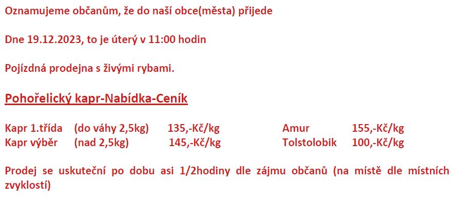 Oznamujeme, že do naší obce dne 19.12.2023 v 11.00 před obecní úřad přijede pojízdná prodejna s živými rybami. Prodej se uskuteční po dobu cca 30 minut dle zájmu.